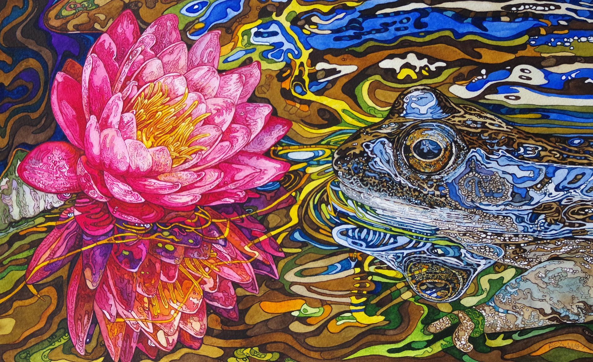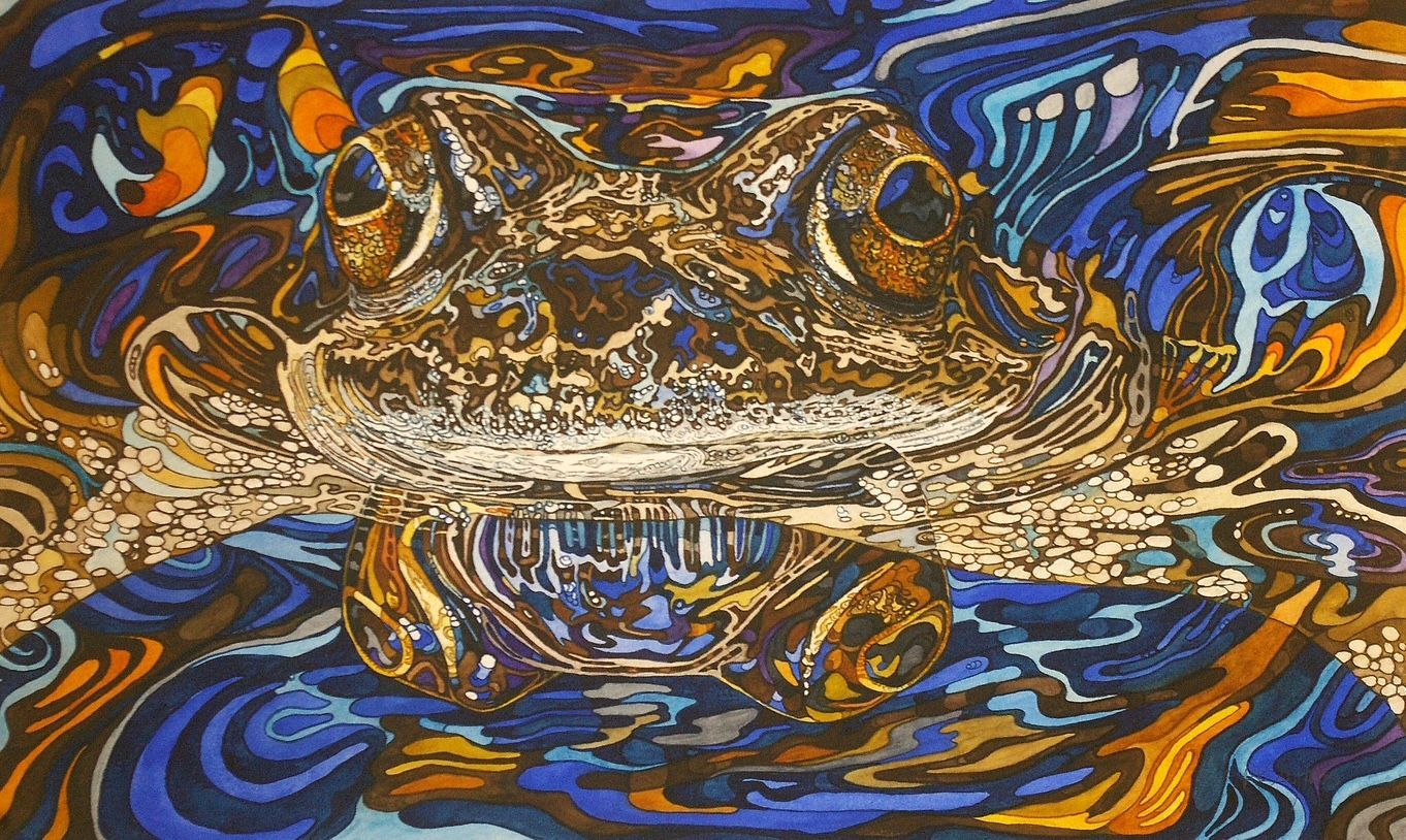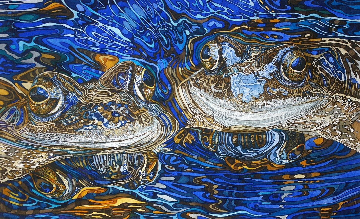 My watercolour paintings of otters in water capture movement, light, and atmosphere in a uniquely fluid way. The transparency of the medium perfectly reflects the nature of water itself — soft washes blending into ripples, deeper tones suggesting hidden depths. An otter gliding across the surface creates shimmering reflections that distort trees, sky, and riverbanks into abstract patterns of colour. Browns and silvers of wet fur contrast with blues and greens beneath, while mirrored shapes dance around the animal’s form. These reflections are never exact, but broken and alive, adding energy and mystery to the scene, making the whole environment part of the story.